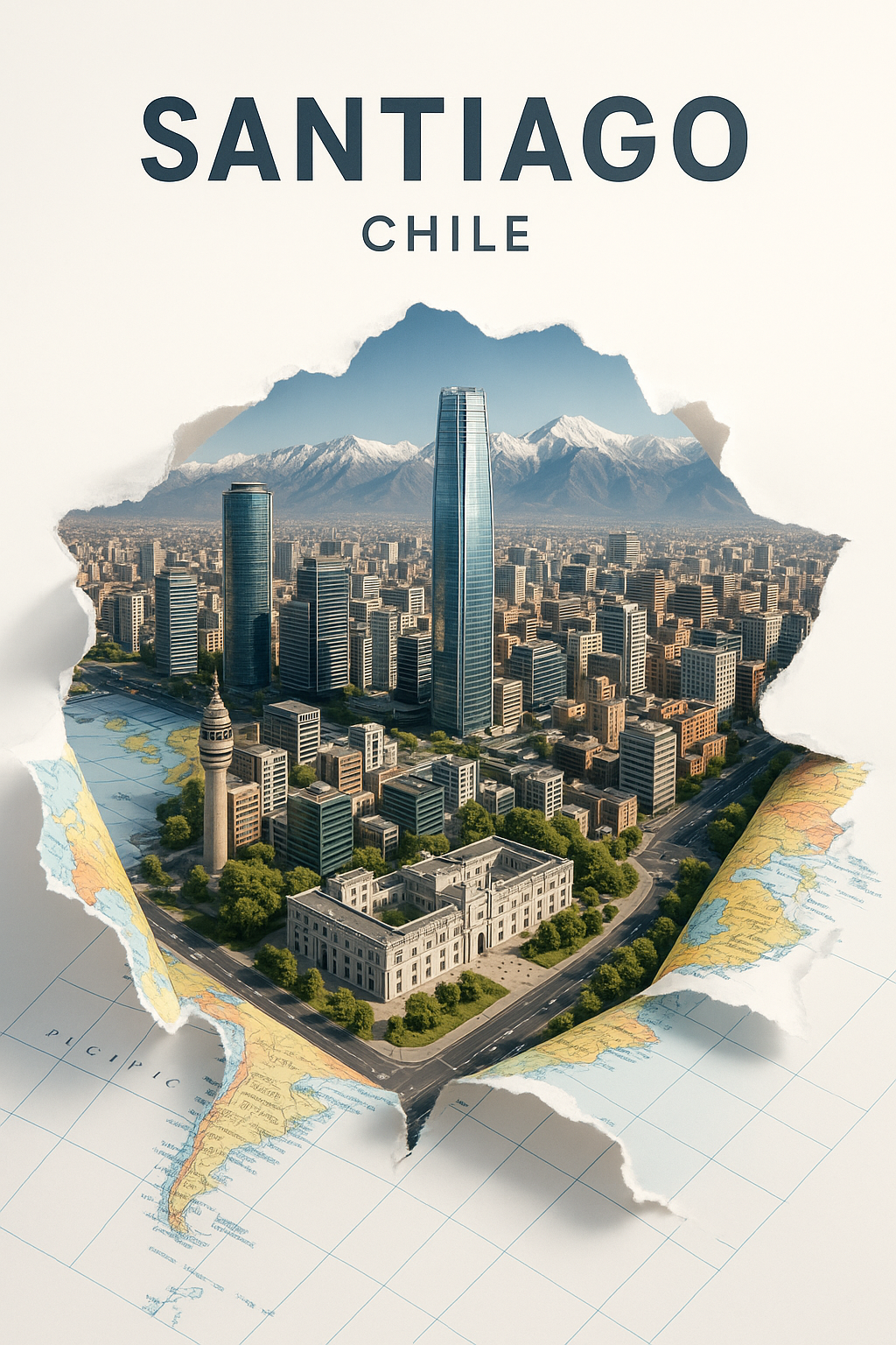 The image features the city of Santiago, the capital of Chile, with its modern buildings and majestic mountains in the background. The main highlight is the effect that creates the illusion of the cityscape emerging from a map of South America. The tall towers and architectural landmarks of the city, such as the clock tower building and historical complex, showcase a blend of modernity and classic style. In the foreground, a part of the map is unfolded and noticeably torn, adding dynamism and drawing attention to the central subject of the image. This approach allows the viewer to appreciate the uniqueness and beauty of Santiago, as well as its geographical location against the backdrop of the Andes mountains.