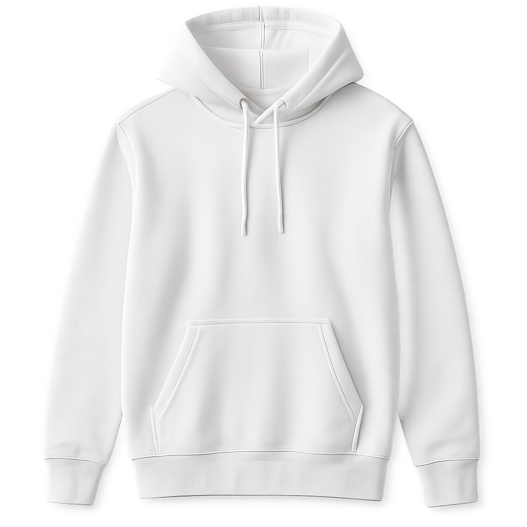 The image shows a white hoodie with a hood made from soft material. It features a classic design with long sleeves and a front kangaroo pocket, suitable for storing small items or warming hands. The hood is adorned with drawstrings for adjustability, allowing it to fit snugly on the head.
