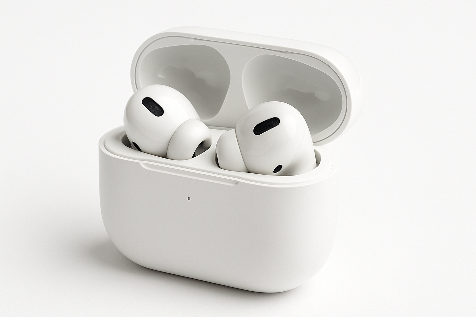 The image features wireless earbuds neatly placed in a charging case. The earbuds have a light-colored casing, giving them an elegant and modern appearance. The case has a rounded shape and is made of white matte plastic. It opens with a movable lid, beneath which the earbuds are situated in special indentations for charging. The earbuds have characteristic black elements responsible for sound and control. This image highlights the stylish design and functionality of the device, making it attractive to users who prefer sleek and innovative gadgets.