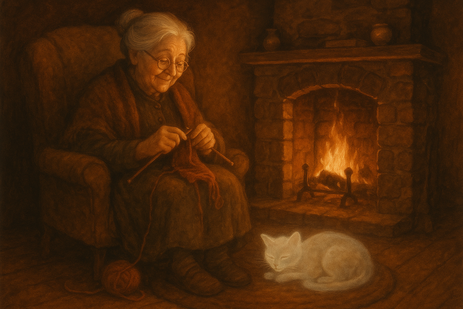 En la imagen se muestra a una anciana sentada en un sillón acogedor, completamente absorta en su tejido. Tiene el cabello claro recogido en un moño y unas gafas que a veces ajusta. La mujer viste un vestido oscuro y un chal marrón áspero que resalta su calidez y confort. A su lado, descansa un gato blanco que añade un aire de tranquilidad. El sillón está en un ambiente cálido con una chimenea, donde arde el fuego, creando una suave y acogedora iluminación. En las paredes hay piedras visibles y estanterías con macetas pequeñas. Todos los detalles están retratados con amor, transmitiendo una atmósfera de hogar y calidez.