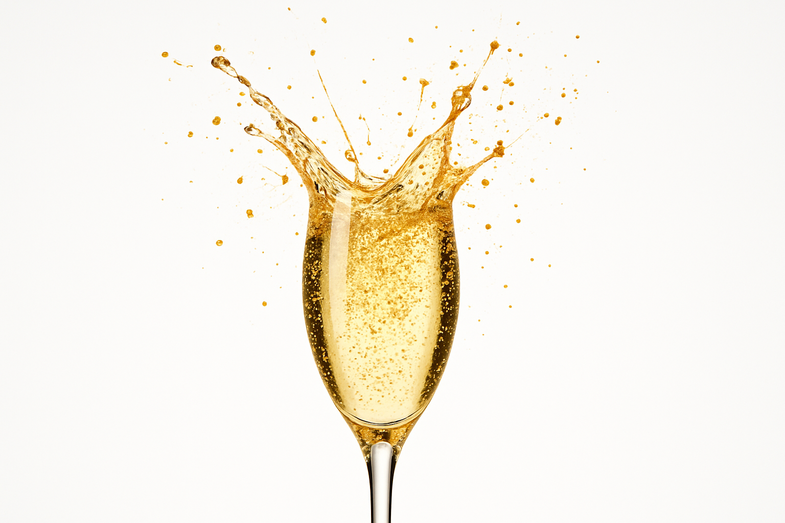 La imagen muestra una copa llena de bebida espumosa, probablemente champán o vino espumoso. La bebida tiene un tono dorado y de ella brotan salpicaduras turbulentas, creando una composición dinámica sobre un fondo blanco. El agua se eleva alto, formando numerosas gotitas pequeñas que también brillan a la luz. La copa tiene un estilo elegante y su forma es sobria, lo que añade sofisticación a la imagen.