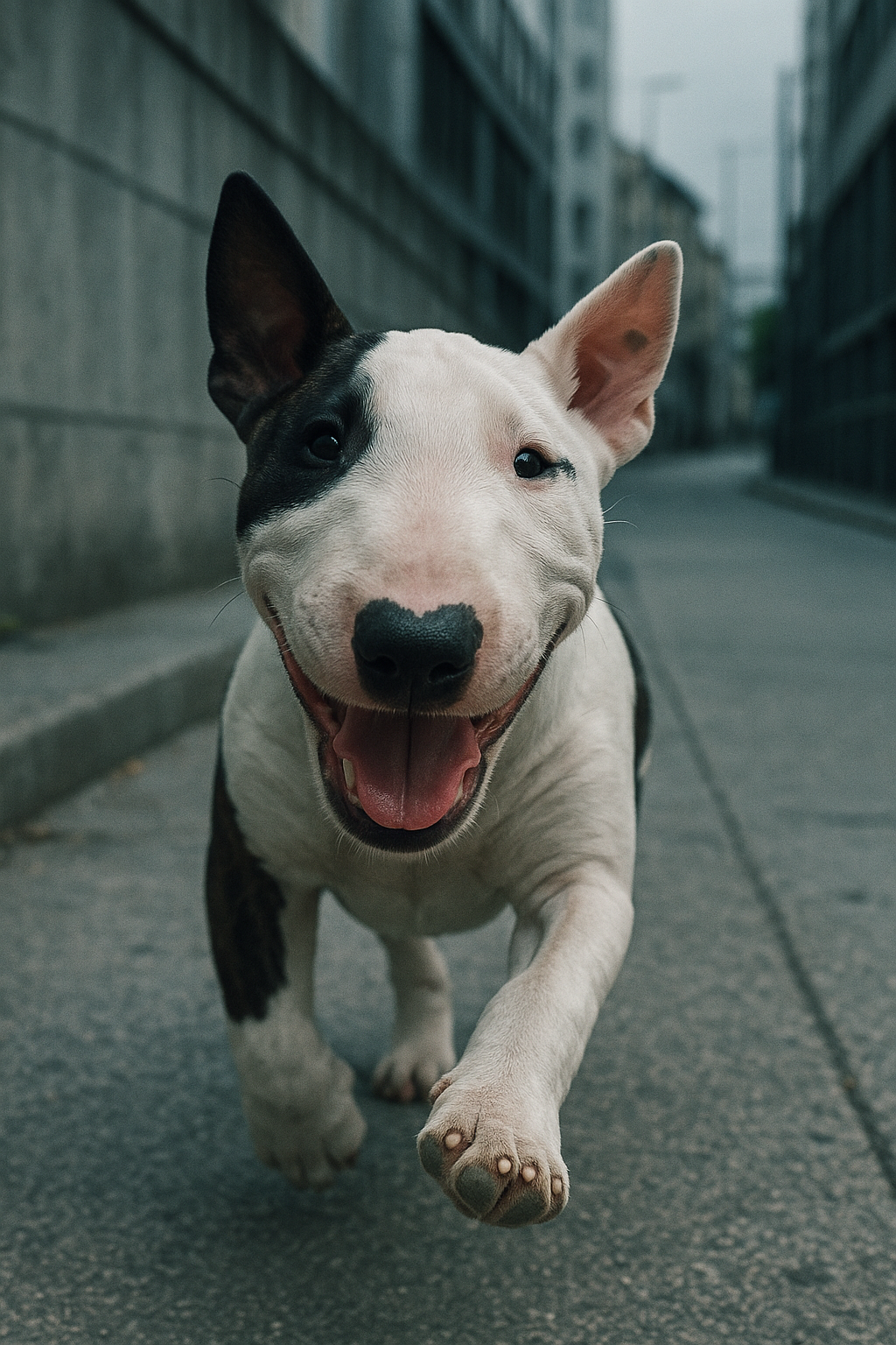 En la imagen se captura a un bulldog que sonríe mientras corre por una estrecha calle urbana. El perro con un característico pelaje blanco y negro, con una oreja en pie y otra caída, se integra perfectamente en el paisaje urbano circundante. El fondo está compuesto por edificios de concreto que crean una atmósfera de espacio urbano. La calle se ve desierta, lo que le da a la imagen una sensación especial de libertad y alegría. El perro expresa felicidad y juguetonería, convirtiéndose en el centro de atención. La fotografía captura un momento de movimiento, creando una impresión de dinamismo y vida.