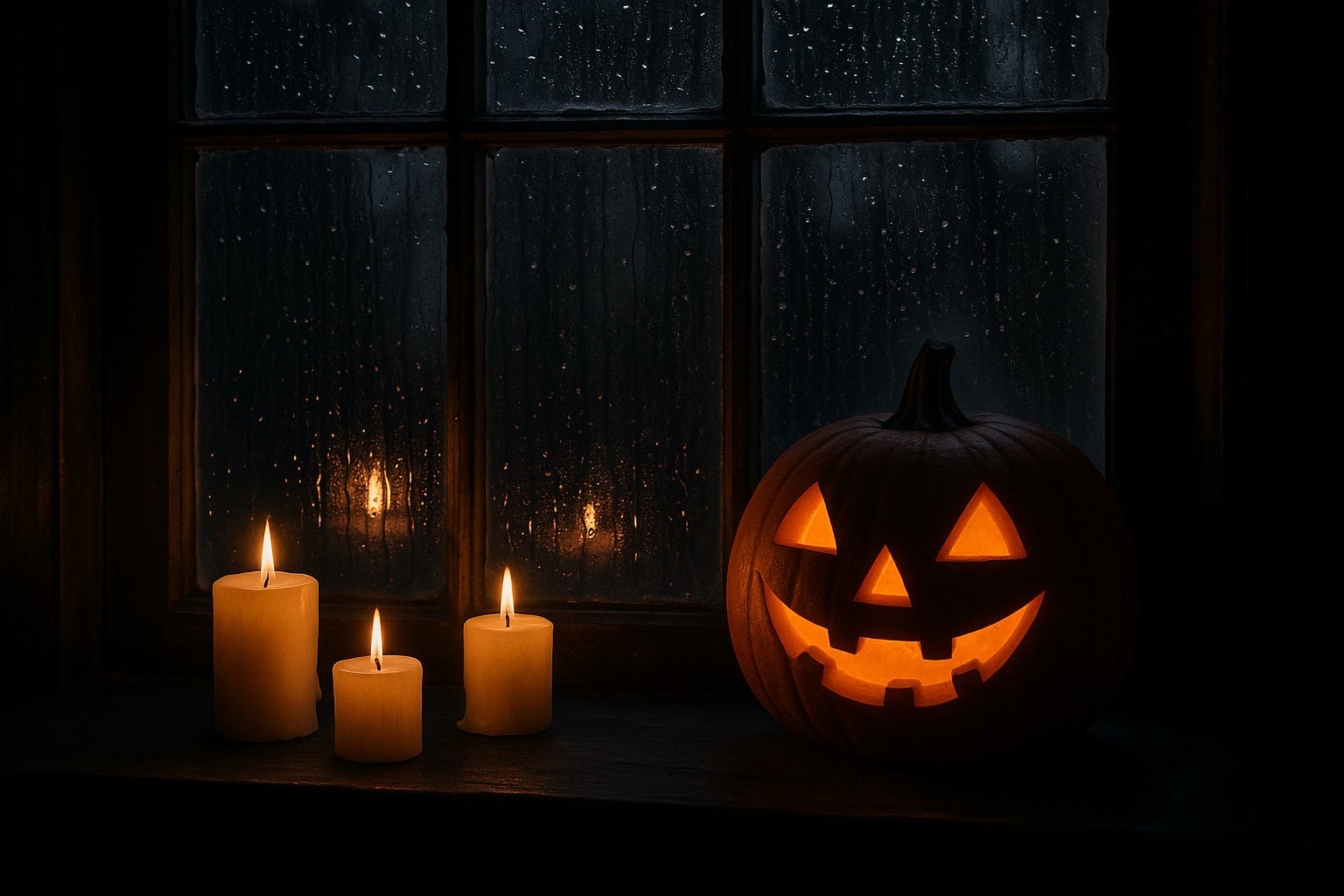 En la imagen vemos una calabaza iluminada con un diseño clásico de rostro, situada en el alféizar de una ventana. Junto a ella hay tres velas, cuya luz aumenta la atmósfera mística de la noche. Fuera, está lloviendo, las gotas corren por el cristal, creando un efecto de noche fría. En el fondo se ven luces tenues, lo que refuerza la sensación de intimidad y misterio.