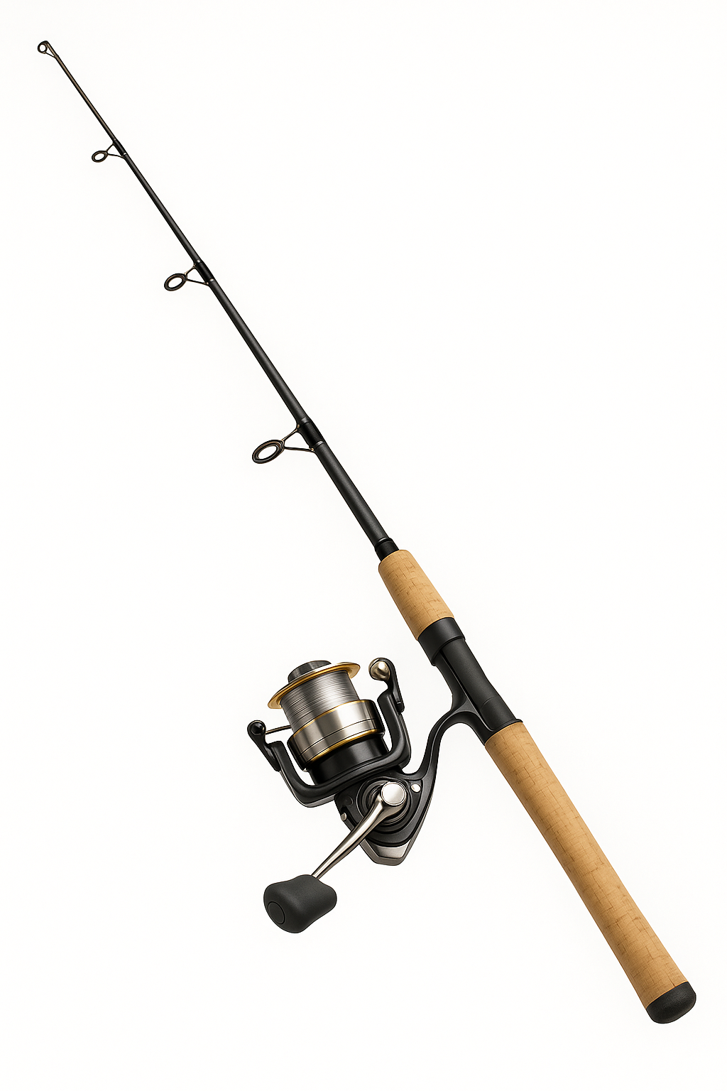 La imagen presenta un conjunto de pesca que consiste en una caña y un carrete. La caña está hecha en color negro y tiene varios anillos para el sedal, lo que proporciona una excelente sensibilidad y control al pescar. El mango de madera ofrece un agarre cómodo y añade valor estético. El carrete, ubicado en la parte inferior de la imagen, está hecho de un metal ligero y componentes de plástico, con un diseño original que tiene acentos dorados. Este conjunto es ideal tanto para principiantes como para pescadores experimentados.