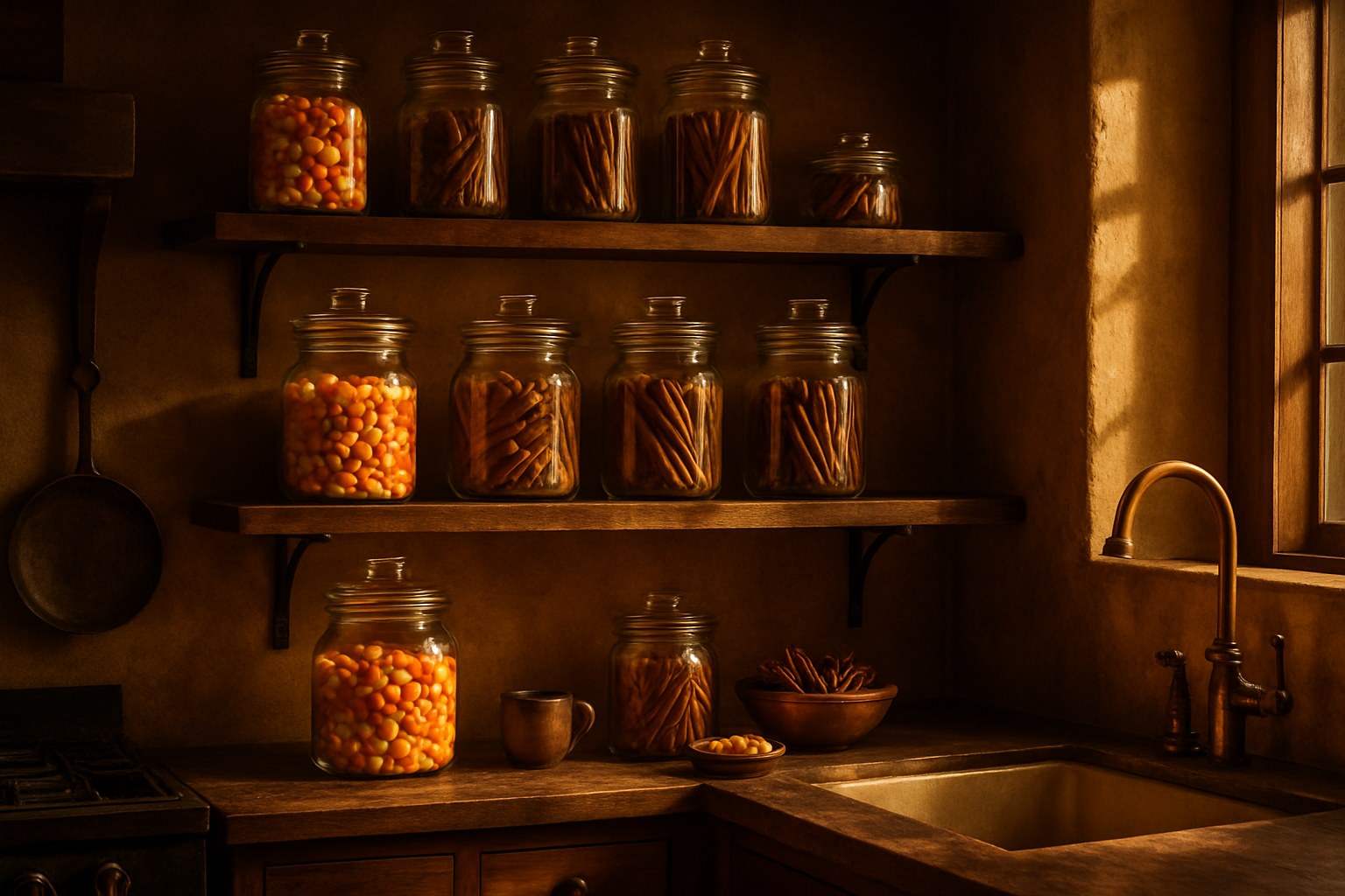 La imagen muestra una cocina acogedora con estanterías de madera, donde están ubicuados frascos de vidrio. Los frascos contienen dulces y galletas de diversas formas y colores. En la estantería superior hay frascos con dulces brillantes, principalmente en tonos naranjas y amarillos. En la estantería inferior se encuentran galletas y un cuenco de madera con golosinas. La iluminación en el espacio crea un ambiente cálido y amigable, resaltando las texturas de la madera y el vidrio, mientras que el fondo de las paredes está pintado en tonos suaves y neutros.