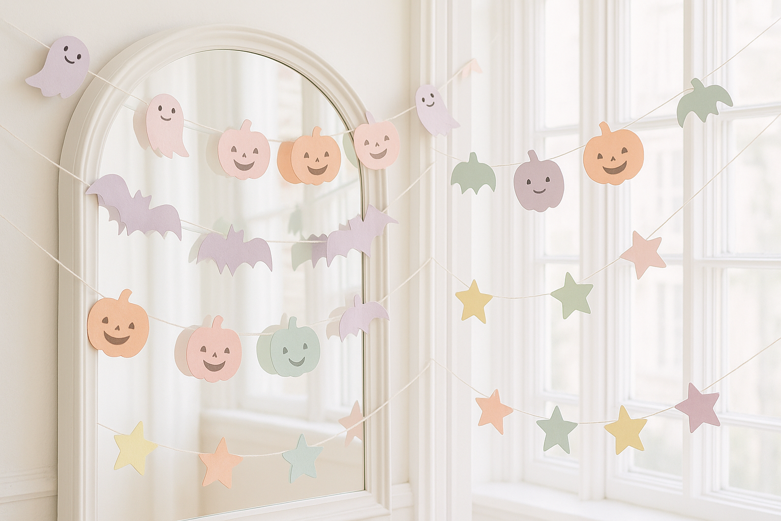 La imagen muestra una acogedora decoración de otoño, compuesta por guirnaldas hechas de papel. Las guirnaldas incluyen imágenes de calabazas, fantasmas y murciélagos. Estos adorables personajes están colocados frente a un espejo y ventanas claras, resaltando la atmósfera festiva. Las calabazas tienen ojos sonrientes y parecen amigables, mientras que los fantasmas y murciélagos están en tonos pastel, creando una iluminación suave y reconfortante. Las guirnaldas están decoradas con estrellas de colores, que añaden un toque lúdico y brillante a toda la decoración.