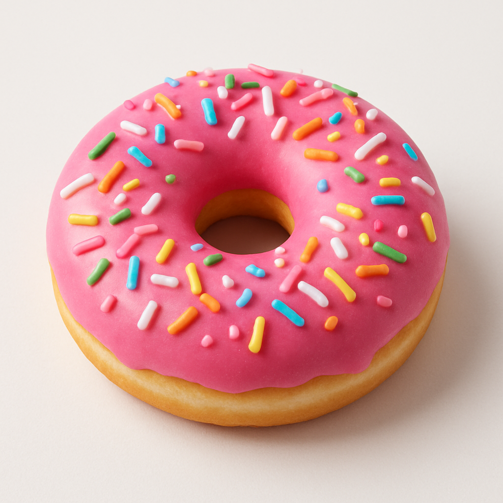 En la imagen se presenta una dona cubierta con un brillante glaseado rosa, sobre el cual hay esparcidas chispas de colores. La dona tiene una forma clásica con un agujero en el centro y una corteza dorada en los bordes. La gama de colores resalta su alegría y atractivo, creando una sensación de dulzura y celebración. Este tipo de panadería suele asociarse con placeres culinarios y postres, y a menudo se sirve en celebraciones o junto a una taza de café.