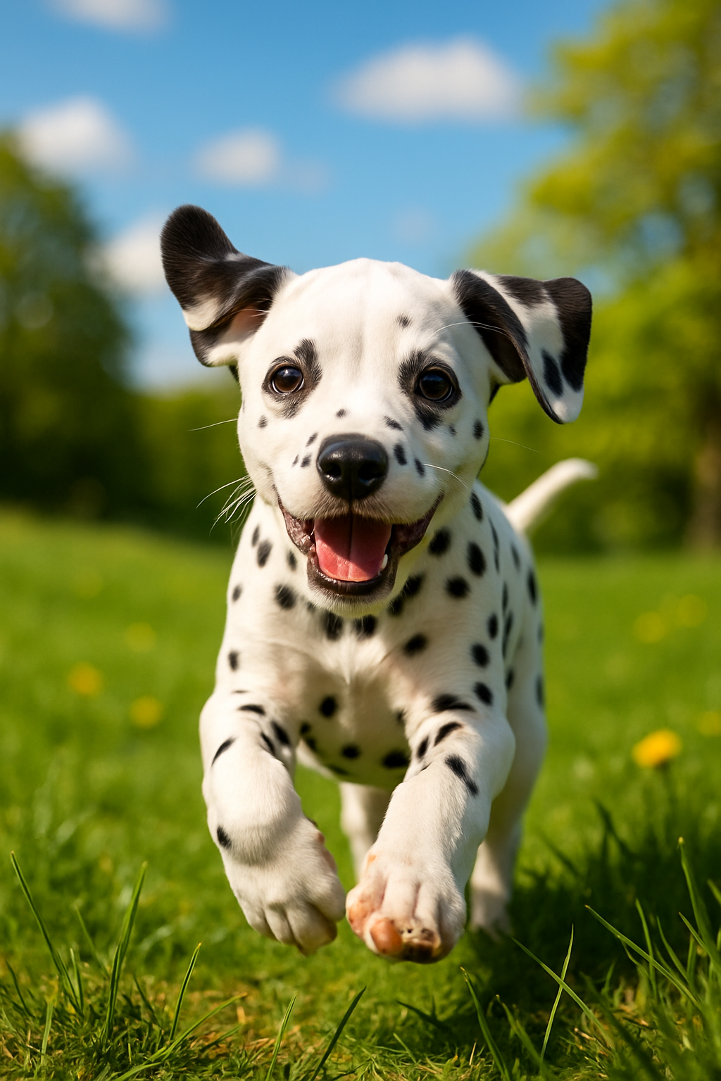 En la imagen se muestra un cachorro de la raza dálmata, que corre por el prado verde con una expresión alegre en su rostro. Su pelaje blanco está cubierto de manchas negras, creando el aspecto característico de esta raza. El cachorro parece feliz y lleno de energía, con las orejas levantadas y los ojos bien abiertos. A su alrededor se extiende la hierba verde, y al fondo se pueden ver árboles y un cielo azul con nubes ligeras, creando una atmósfera de un día soleado y espacioso.