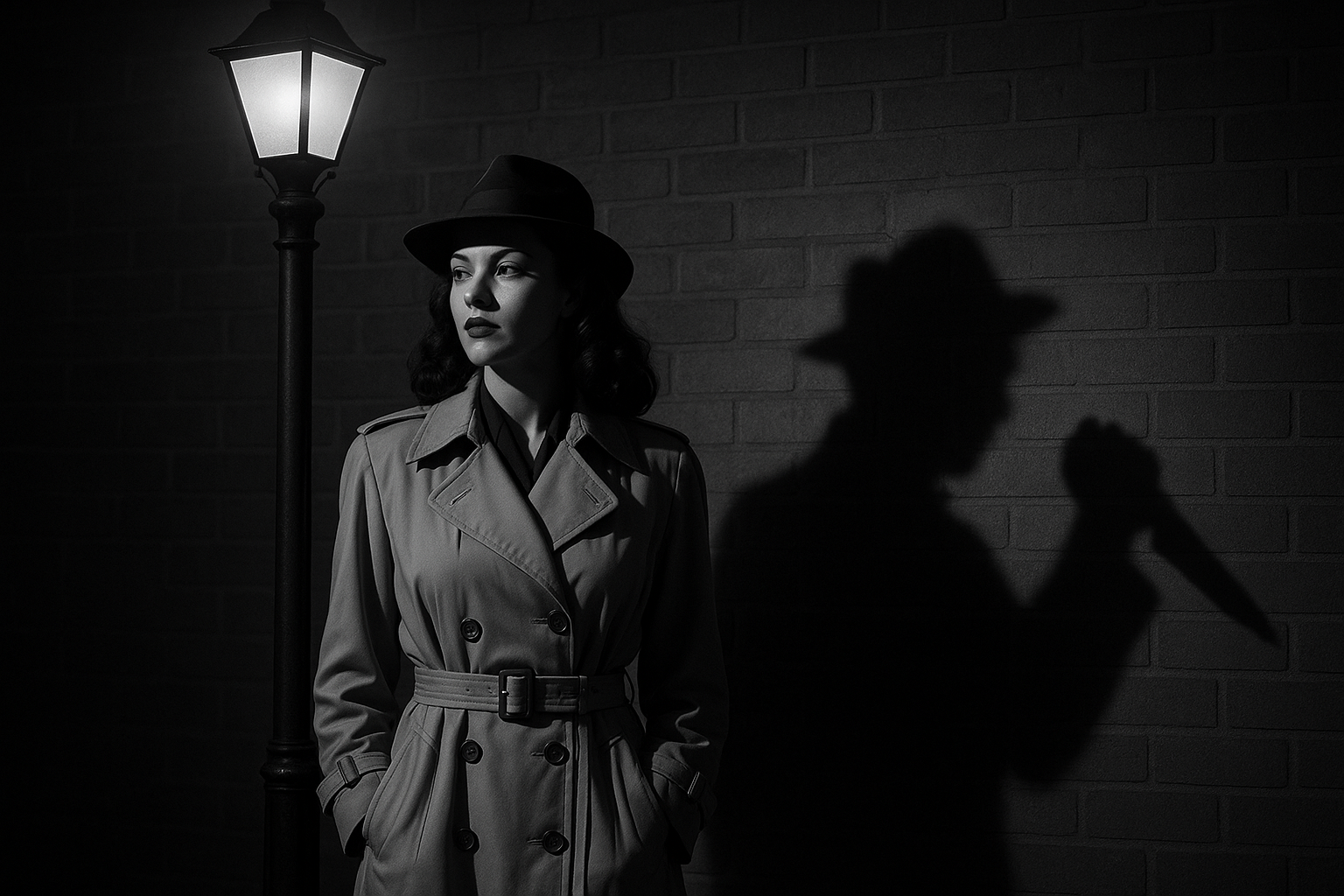 La imagen muestra a una mujer con un abrigo claro y un sombrero negro, de pie junto a una farola en un callejón oscuro. La luz brillante de la farola acentúa su rostro y sus delicadas facciones, creando un contraste con la oscuridad circundante. En la pared detrás de ella se ve su sombra, que representa una figura con un cuchillo, lo que añade un elemento de misterio y preocupación.