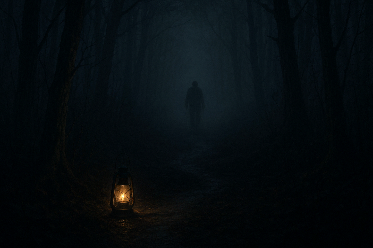 En la imagen se muestra un bosque brumoso, al que conduce un sendero serpenteante. A la izquierda en primer plano hay una antigua linterna que emite una suave luz amarilla. La linterna contrasta con el oscuro entorno, mientras la niebla envuelve todo a su alrededor, dando a la escena un aspecto misterioso. A lo lejos se puede ver la silueta de una persona que se mueve lentamente hacia el sendero, llenando la composición con una sensación de incertidumbre y expectativa. Los árboles a su alrededor parecen siniestros, con sus ramas entrelazadas creando una atmósfera de enigma. En un bosque así se puede sentir una pesada calma y un misterio que puede atraer o repeler.
