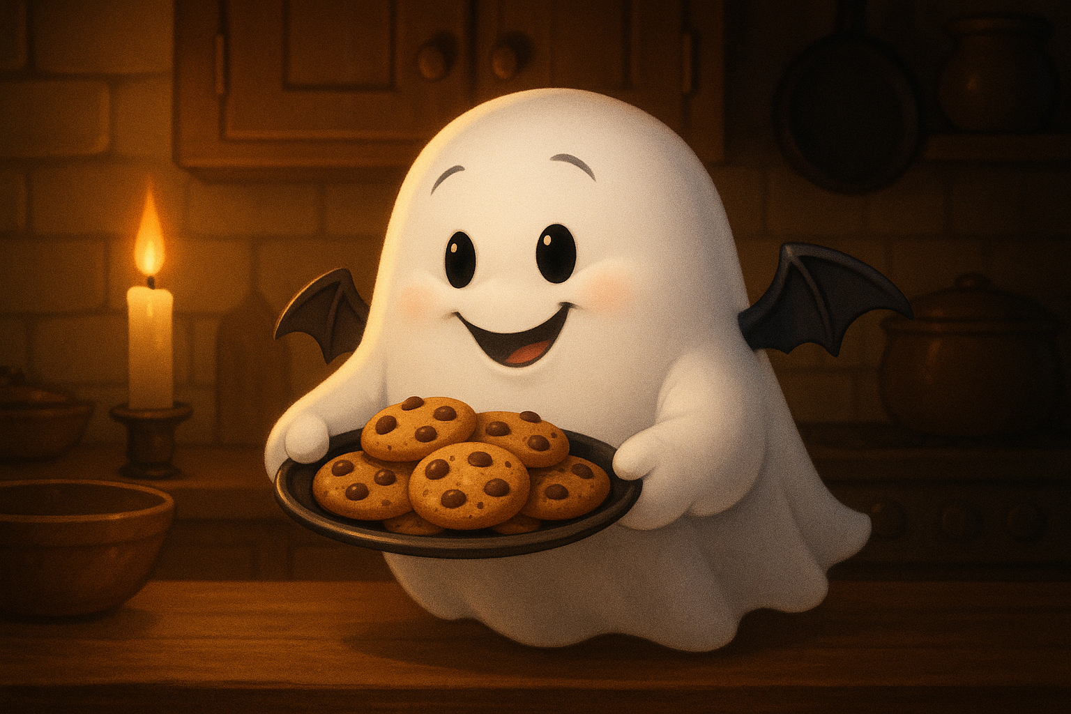 La imagen presenta un lindo fantasma con alas, que alegremente sostiene un plato de galletas. El fondo está realizado en tonos cálidos, creando una atmósfera acogedora. En la parte posterior se puede ver una antigua cocina con armarios de madera y utensilios, complementada por la suave luz de una vela, lo que le da un aspecto mágico a la escena. La cara del fantasma expresa felicidad, lo que añade un toque amigable y juguetón a la imagen.