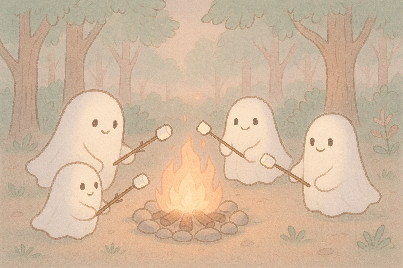La imagen presenta a cuatro fantasmas amigables reunidos alrededor de un cálido fuego en el bosque. Cada fantasma sostiene un palo con un malvavisco y observa con interés las llamas. El fondo forestal está adornado con árboles verdes y suaves arbustos, creando una atmósfera de acogimiento y tranquilidad. Los fantasmas aparecen sonriendo, lo que le da un tono juguetón y amistoso a la escena. La luz cálida del fuego ilumina sus figuras transparentes, destacando la suavidad y la sutileza de la imagen. Da la impresión de que están disfrutando del momento, sumergidos en la relajante atmósfera de la fogata nocturna.