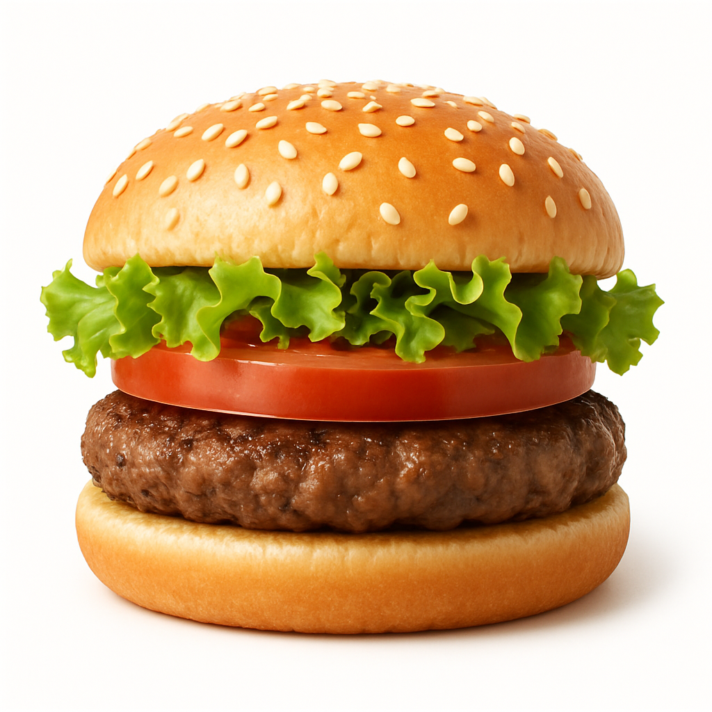 La imagen presenta una hamburguesa clásica, compuesta de un panecillo suave y ingredientes frescos. En la parte superior se encuentra un pan dorado con semillas de sésamo, que tiene un ligero brillo. Debajo del pan hay hojas de lechuga de un verde brillante, y debajo de ellas se encuentran jugosas rodajas de tomate, que aportan color y frescura a la hamburguesa. El componente principal es una apetecible carne de res, que tiene un color marrón intenso, indicativo de su alto grado de cocción. El pan inferior tiene una superficie lisa y está ligeramente dorado, lo que también añade atractivo al plato. El fondo de la imagen es blanco, lo que ayuda a centrar la atención en la hamburguesa y resalta su textura y contrastes de color.