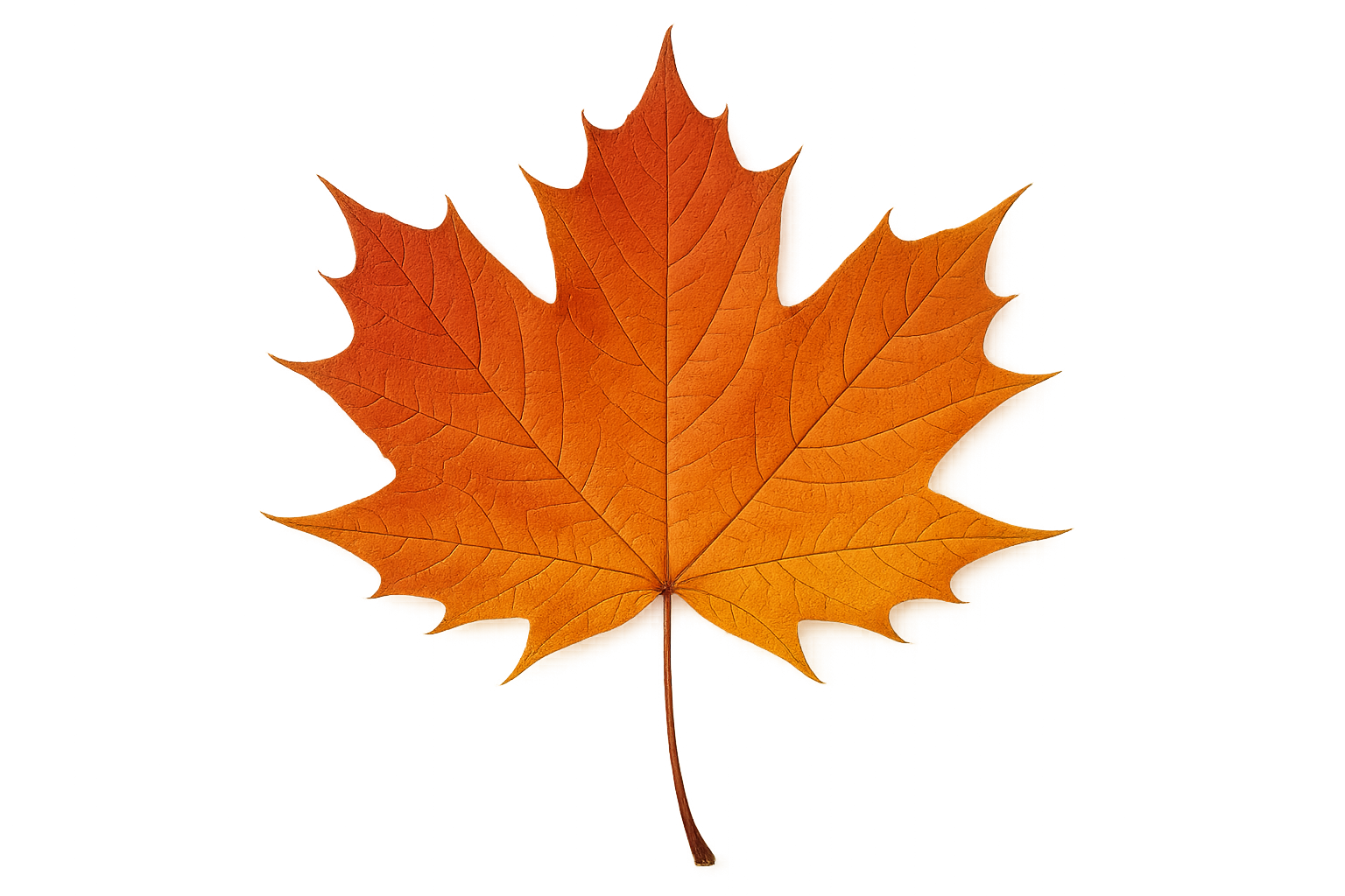 La imagen presenta una hoja de arce otoñal. La hoja tiene un contorno pentagonal característico con venas bien definidas, así como un color naranja brillante que se desvanece a un tono más claro hacia el centro. Los colores de la hoja resaltan los cambios estacionales en la naturaleza, simbolizando la transición del verano al invierno. El fondo de la fotografía es negro, lo que permite que la hoja destaque y capte la atención. Esta obra puede usarse tanto como elemento de fotografía natural como en textos relacionados con la ecología, la temporada de otoño o incluso en el diseño de interiores donde se necesitan imágenes de la naturaleza.