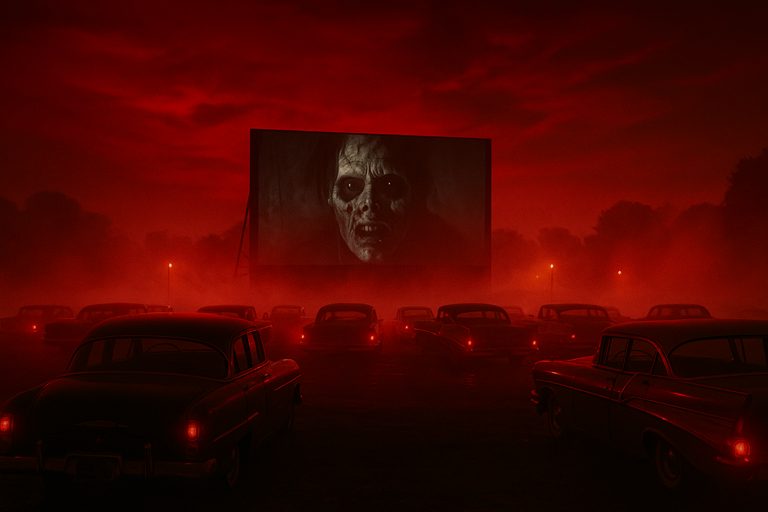 La imagen presenta una escena en un cine nocturno, donde bajo un cielo rojo ominoso se muestra en la gran pantalla un rostro aterrador. Muchos automóviles antiguos se encuentran frente a la pantalla, creando una atmósfera retro. La iluminación de las farolas y la niebla en el aire intensifican la sensación de inquietud y oscuridad. Esta imagen evoca asociaciones con el género de terror y misticismo, sumergiendo al espectador en un mundo misterioso y aterrador.