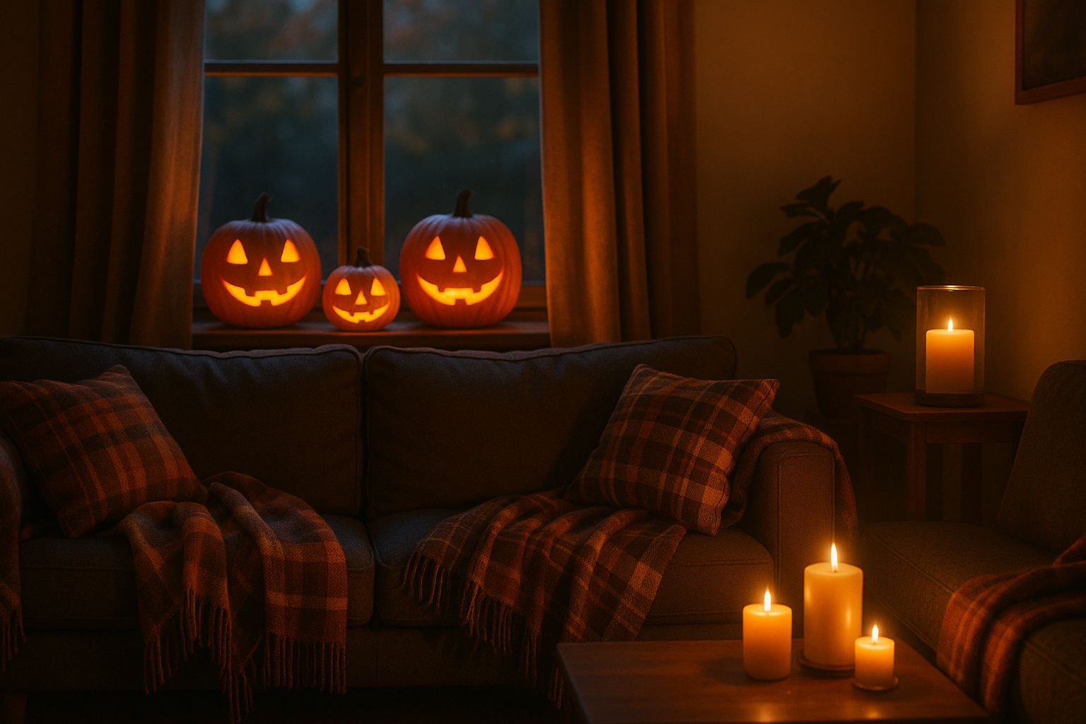 La imagen muestra una habitación acogedora decorada en el espíritu de Halloween.