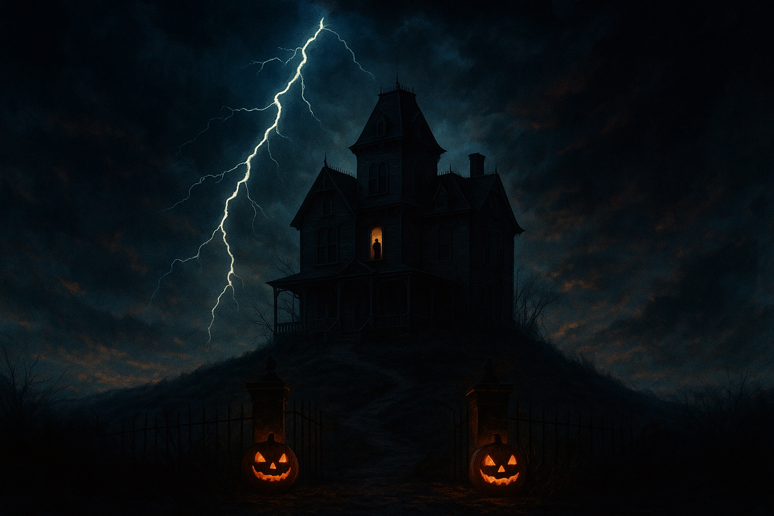 La imagen captura una casa siniestra, situada en una colina. Está rodeada de una atmósfera sombría, creada por nubes de tormenta y relámpagos destellando en el cielo. En la esquina izquierda de la toma, hay dos calabazas sonrientes, cada una brillando con una cálida luz naranja. La luz de la ventana de la casa acentúa su aspecto siniestro, creando un contraste con la oscuridad que las rodea. En general, la imagen crea una sensación de misterio y anticipación de algo increíble.
