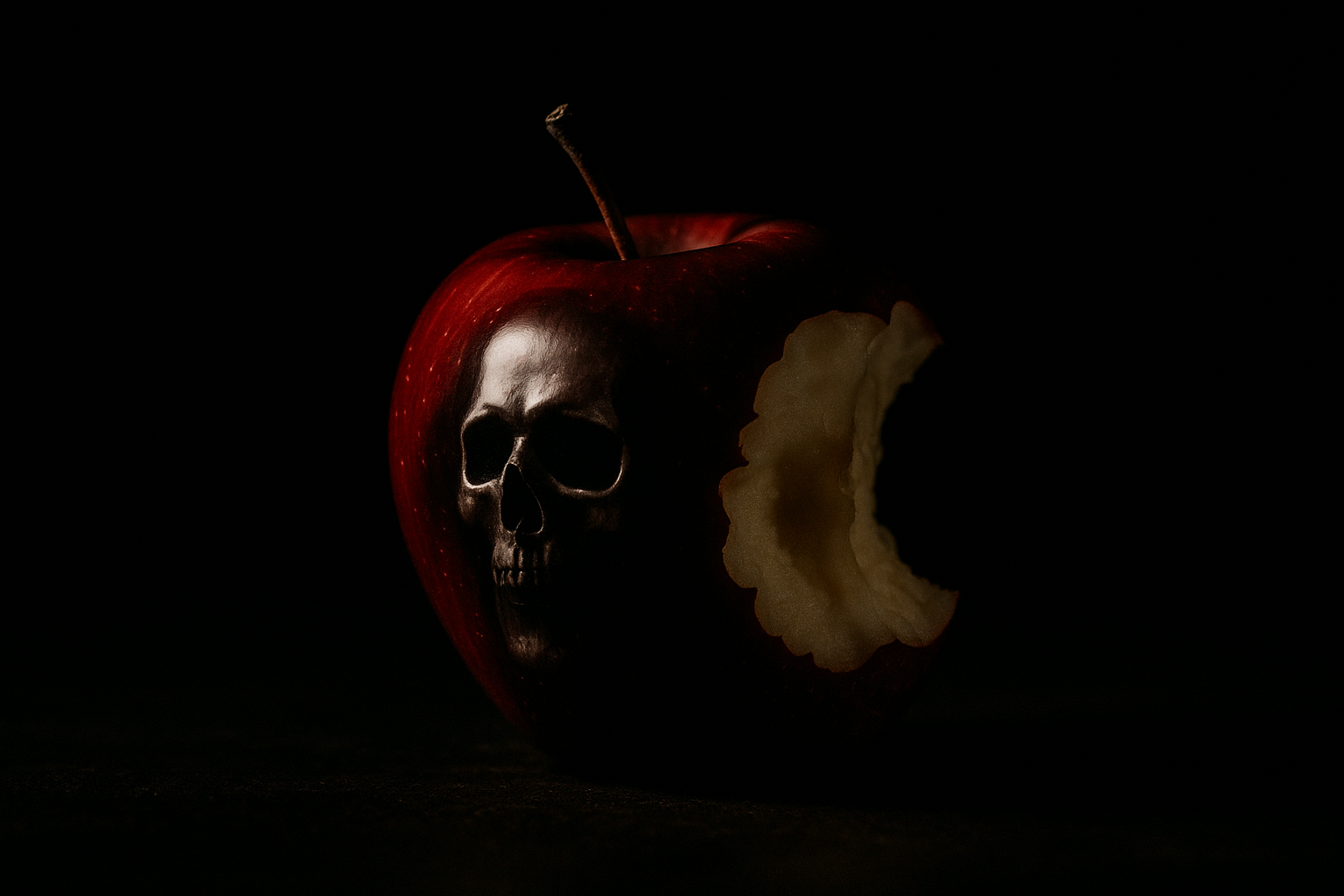 En la imagen se presenta una manzana roja, en la cual se ha cortado un silueta de calavera en el lateral. El fondo es oscuro, lo que resalta los detalles de la fruta y la calavera. La manzana parece apetecible, pero su diseño inusual evoca asociaciones contradictorias. La mordida en la manzana crea una impresión de descomposición o muerte, lo que intensifica el contraste entre la vida y la muerte. La posición de la manzana sobre el fondo negro la convierte en el foco principal, y su diseño intrigante plantea preguntas sobre el significado y la simbología. Se puede notar cómo los detalles de la manzana, como el brillo de la piel y la textura, se armonizan con el tema sombrío de la calavera.