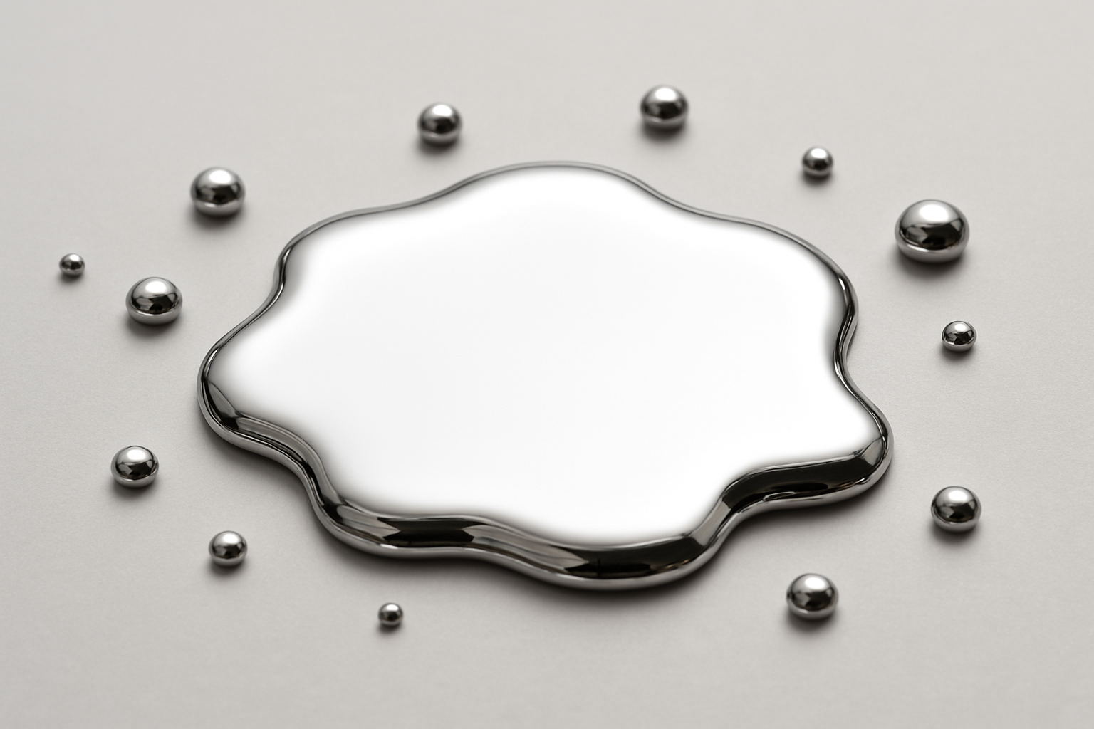 En la imagen se presenta metal líquido con una superficie reflectante que forma un contorno visto de lado. Alrededor del objeto metálico principal se encuentran varias gotas redondeadas, también en estilo metálico. El fondo de la imagen es gris neutro, lo que resalta el brillo y la textura del metal.