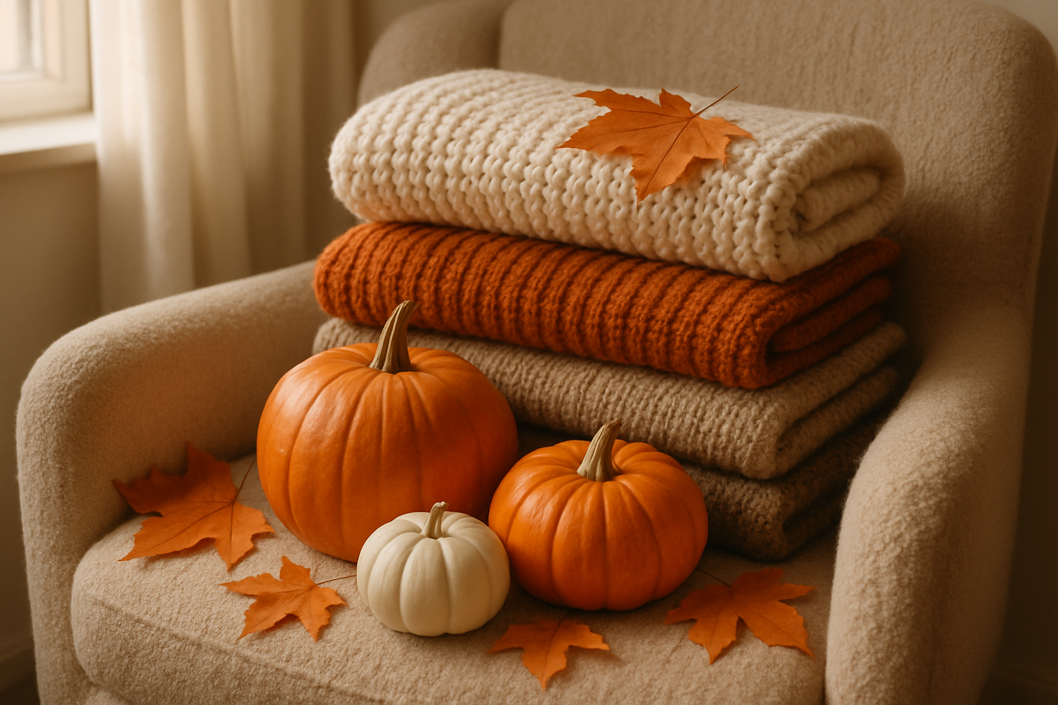 En la imagen se presenta una silla acogedora, sobre la cual están elegantemente dispuestas varias mantas de diferentes tonalidades: crema, naranja y beige. Las mantas están dobladas con cuidado, creando una sensación de calor y confort. Alrededor, están decoradas con calabazas de varios tamaños: dos de un brillante color naranja y una blanca, así como hojas de otoño que descansan sobre la silla y las mantas. La escena está iluminada con una suave luz natural, lo que le da un ambiente cálido y acogedor.