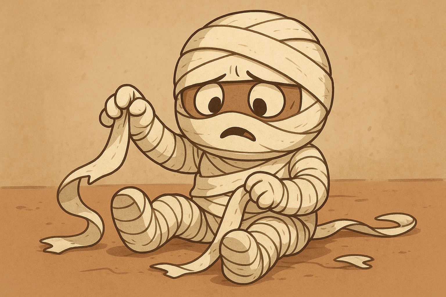 En la imagen se puede ver una pequeña momia sentada en el suelo, tratando en vano de controlar unas vendas que parecen no obedecer. La momia luce confundida y un poco preocupada; sus ojos grandes y expresivos transmiten una mezcla de emociones. Su cuerpo está completamente envuelto en vendas, excepto su rostro que expresa sentimientos. El fondo está en tonos pasteles, lo que crea una atmósfera suave.