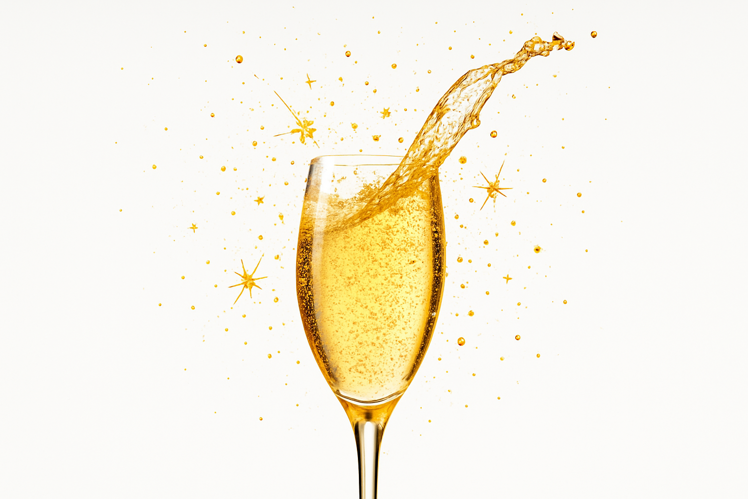 La imagen presenta un primer plano de una copa de vidrio llena de una bebida espumosa, que forma salpicaduras al ser servida. El fondo de la imagen es blanco, lo que crea un contraste con los tonos dorados de la bebida y las chispas, que se sienten como una explosión de alegría y celebración. Las salpicaduras rodean la copa, recordando momentos felices como celebraciones y festivos. El vidrio de la copa tiene un aspecto refinado con un tallo largo, lo que subraya la elegancia de la situación, creando una sensación de evento sofisticado.