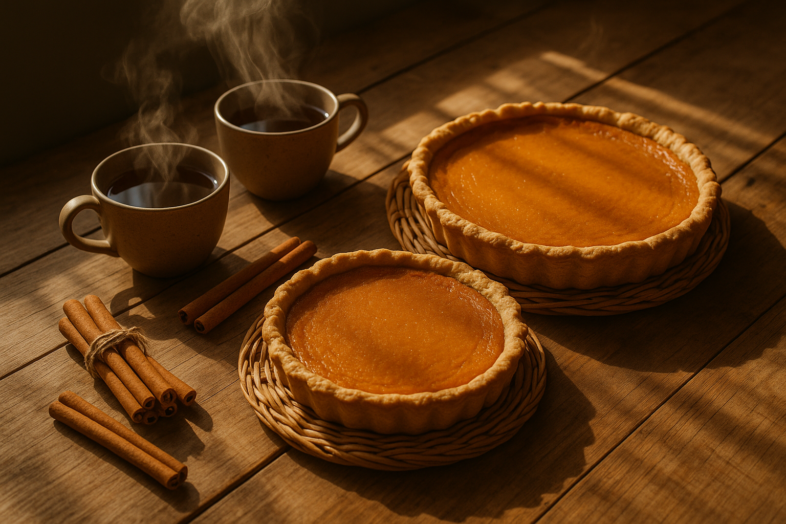 La imagen presenta dos empanadas apetitosas, colocadas sobre bandejas trenzadas, junto a tazas de té caliente. Las empanadas tienen una corteza dorada que promete un gran sabor, y su superficie refleja la luz, creando una atmósfera cálida. Las tazas de té humean, añadiendo una sensación de acogimiento y calidez hogareña. También se pueden ver palitos de canela en la mesa, lo que resalta la sencillez y naturalidad de toda la presentación. La luz que entra por la ventana crea suaves sombras y establece un estado de ánimo relajante, haciendo de este momento el ideal para disfrutar de la repostería casera.