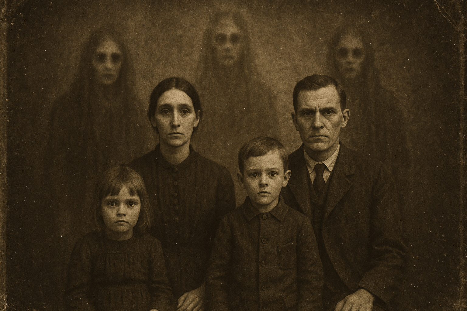 La imagen presenta a un grupo familiar compuesto por cuatro personas: un hombre, una mujer y dos niños. Todos visten ropa antigua, típica de principios del siglo XX. Las expresiones faciales de los miembros de la familia son cautelosas y serias, lo que aporta un cierto misterio a la pintura. Detrás de ellos se pueden ver figuras borrosas que pueden ser percibidas como fantasmas, añadiendo un elemento de misticismo y horror. La paleta de colores de la imagen está compuesta por tonos marrones, creando una atmósfera del tiempo en que fue tomada la fotografía. Hay una sensación de profundidad, ya que las figuras fantasmales están en la sombra, lo que intensifica el efecto de abandono y tragedia.