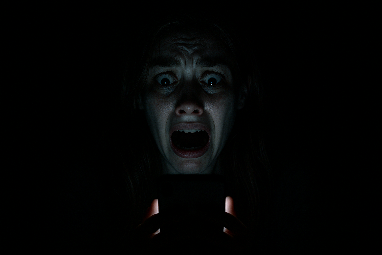 La imagen presenta a una mujer en un ambiente oscuro. Su rostro expresa un intenso miedo y sorpresa, con los ojos muy abiertos. Sostiene en sus manos un smartphone, cuya pantalla brilla intensamente, creando un contraste con la oscuridad que la rodea. Esto genera una atmósfera tensa y subraya la preocupación de la protagonista.