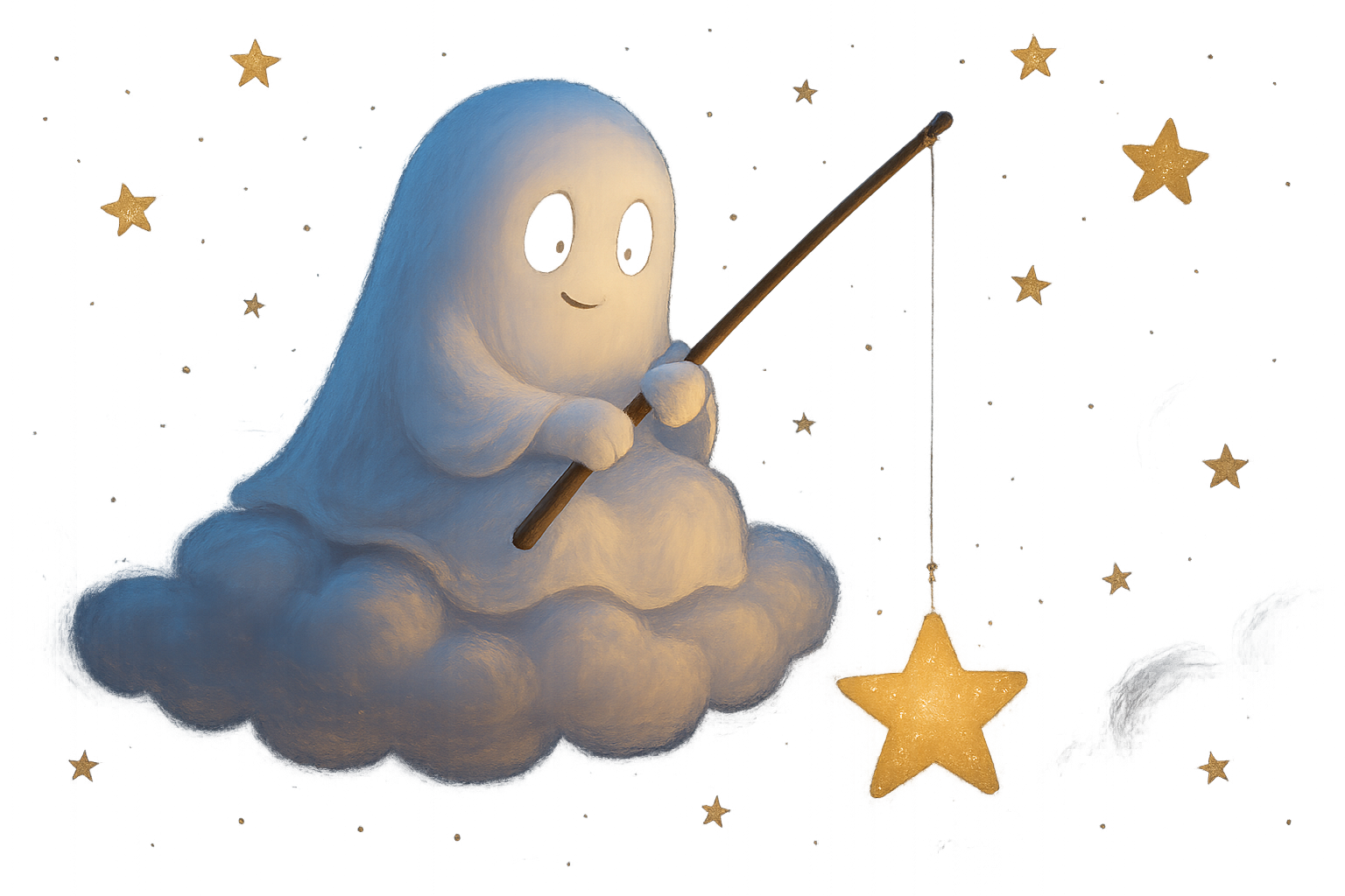 En la imagen se muestra un fantasma amistoso sentado en una nube. Se ve muy tierno y alegre, con grandes ojos y una sonrisa, creando una atmósfera de bondad. El fantasma sostiene una caña de pescar con la que intenta atrapar estrellas que brillan intensamente en el cielo nocturno. Las estrellas representadas en la pintura tienen un tono dorado, lo que realza el ambiente mágico de la escena. La nube en la que se sienta el fantasma es esponjosa y blanca, creando una sensación de ligereza y paz. A lo lejos, apenas se distinguen otros elementos del paisaje nocturno que complementan la imagen. Toda la composición retrata un mundo de cuento de hadas y serenidad, donde el fantasma solo se ocupa de atrapar estrellas.