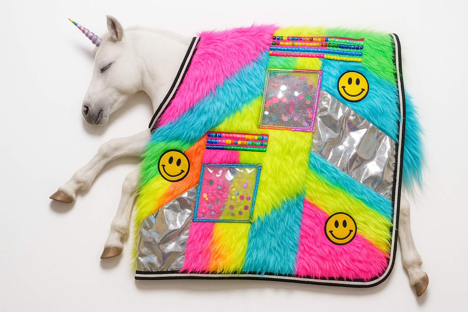 La imagen muestra un unicornio blanco que está durmiendo, cubierto con una capa colorida. La capa está hecha de un suave pelaje y decorada con numerosos detalles brillantes: segmentos morados, verdes, rosados y azules, así como inserciones metálicas. En la tela también se pueden ver varios bolsillos de plástico con purpurina y sonrisas. La cabeza del unicornio está adornada con un llamativo cuerno multicolor que le da un aspecto mágico. La atmósfera de la imagen combina elementos de juego y fantasía, lo que la hace especialmente atractiva para los amantes de la decoración inusual y colorida.