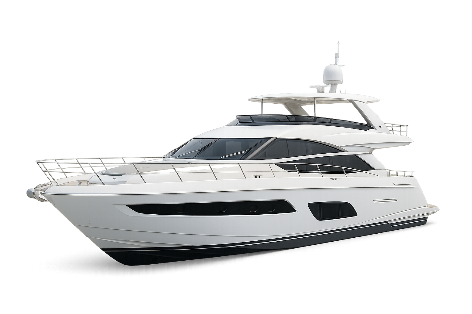 La imagen muestra un yate moderno con un diseño elegante. El yate está pintado de blanco con detalles en negro, lo que le da un aspecto estilizado y contemporáneo. Tiene dos niveles, con una cubierta espaciosa y grandes ventanas que proporcionan una buena vista y un ambiente luminoso en el interior. El diseño del yate destaca por sus formas aerodinámicas, lo que lo hace no solo atractivo, sino también funcional. En la parte trasera se puede ver una plataforma que permite un fácil acceso al agua. Las líneas principales del yate subrayan su gracia, y el equipo moderno a bordo garantiza comodidad para los pasajeros. La imagen fue tomada sobre un fondo negro, lo que hace que el yate sea aún más expresivo y notable.