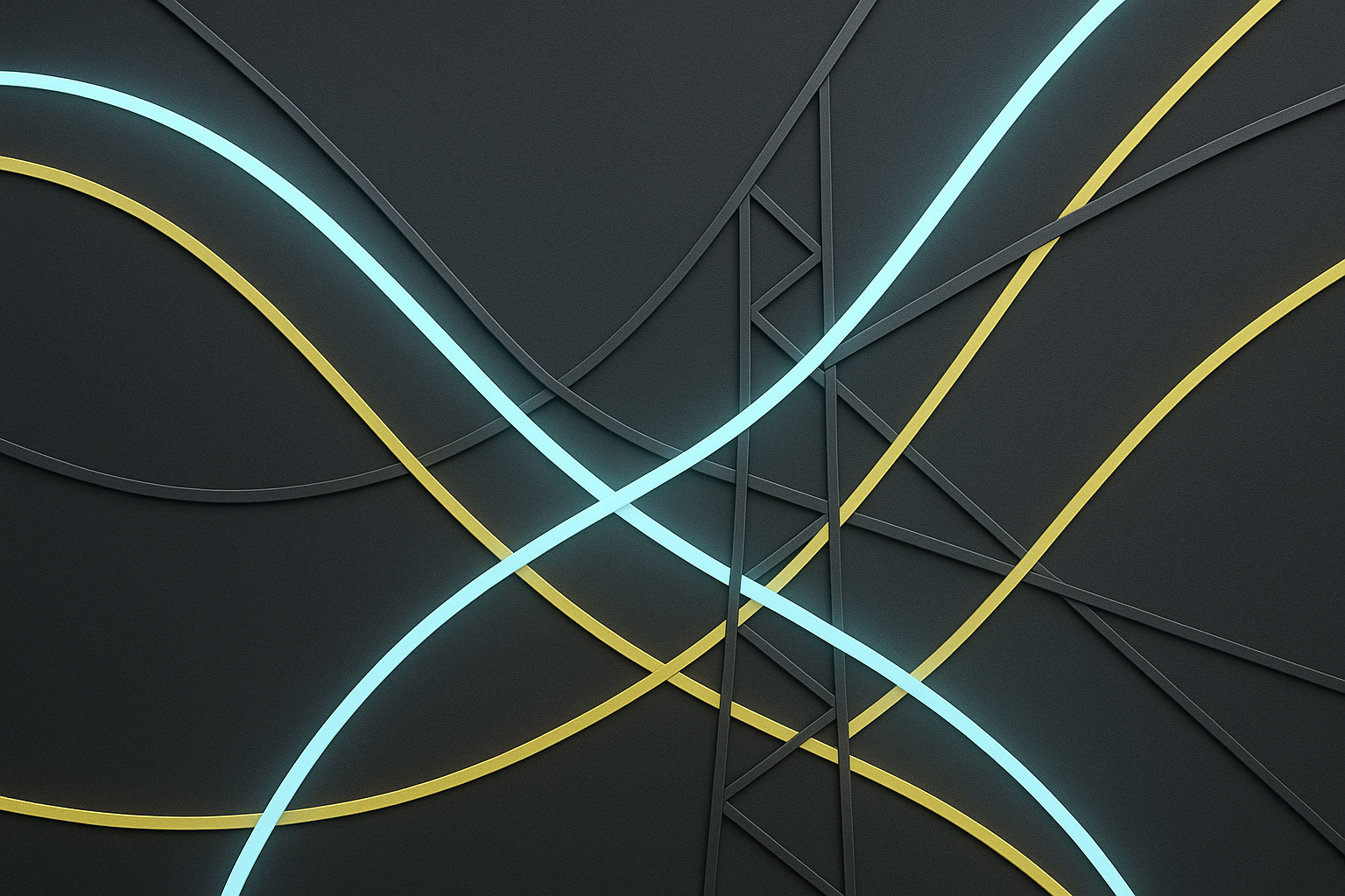 На изображении представлена абстрактная композиция, в которой переплетаются изогнутые линии разных цветов. Линии окрашены в светло-голубой, желтый и черный цвета и располагаются на однотонном темном фоне. Эти линии создают интересные пересечения и визуальные эффектные формы, что придаёт изображению современный и стильный вид. Их изгибы и пересечения образуют динамичную структуру, которая привлекает внимание и вызывает интерес. Композиция в целом выглядит минималистично, но при этом насыщенно. Такой подход может быть использован для передачи идеи о сложности и взаимосвязанности различных элементов.