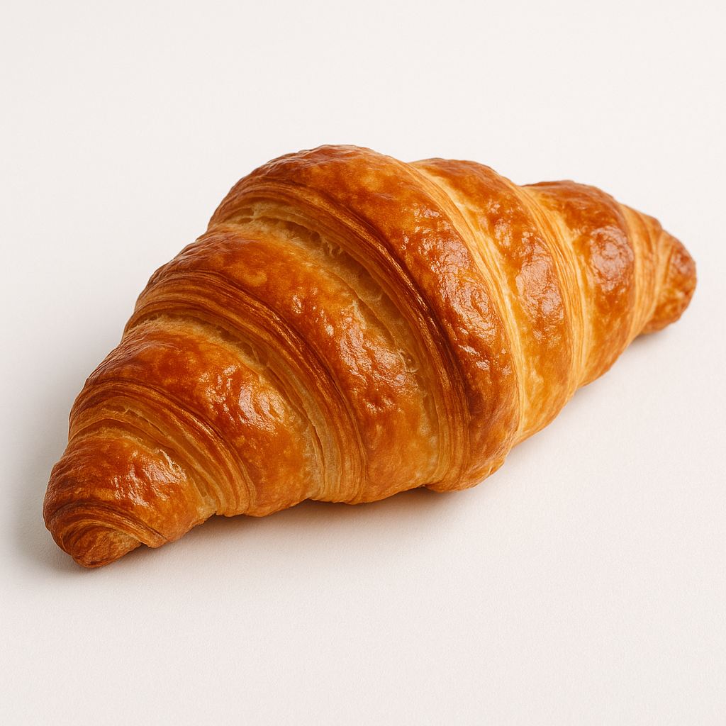 На изображении представлен свежевыпеченный круассан, имеющий характерную форму, напоминающую полумесяц. Этот легкий и воздушный французский десерт отличается хрустящей корочкой и нежной текстурой внутри. Его золотисто-коричневая поверхность интригует и вызывает желание попробовать эту выпечку. Круассан занимает центральное место на белом фоне, что подчеркивает его аппетитный вид и делает его основным объектом в картине. Видно, что круассан аккуратно испечен, так как его слои отчетливо различимы, а поверхность имеет ровный цвет с легким блеском. С помощью этого изображения удается передать все соблазнительные качества французского хлебобулочного изделия.