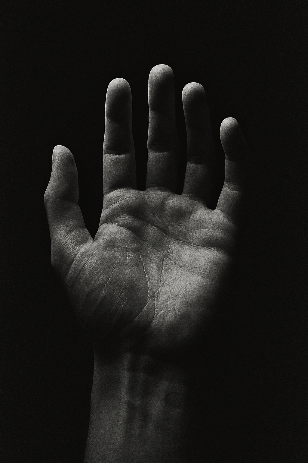 На изображении представлена рука человека, расположенная в ладонном положении на чёрном фоне. Фотография выполнена в чёрно-белых тонах, что придаёт ей выразительность и контраст. Чёткие линии и текстура кожи на ладони подчёркиваются за счёт освещения, создающего тени и объём. Наличие морщин и подробностей на пальцах и ладони добавляет фотографии реалистичности.
