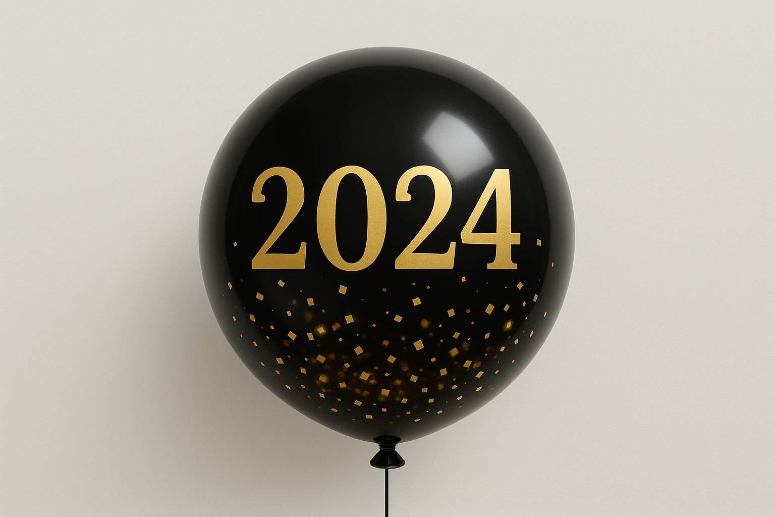 На изображении представлен черный воздушный шар, украшенный золотыми цифрами 2024. Шар имеет глянцевую поверхность, что придаёт ему праздничный вид. В нижней части шара видны мелкие золотые квадраты, что создает эффект блеска и отражает атмосферу праздника. Фон изображения светлый и нейтральный, что позволяет акцентировать внимание на объекте. Данный элемент отлично подходит для различных мероприятий, связанных с новогодними праздниками или юбилеями.