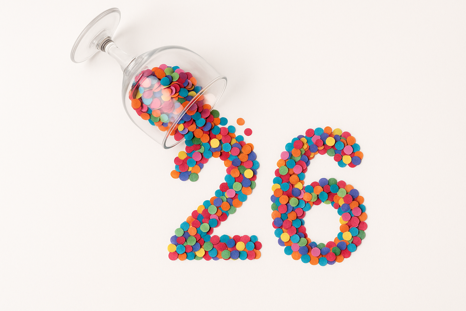 На изображении представлено словообразование в виде цифр "26", составленных из цветных круглых конфетти. Эти яркие элементы хаотично разбросаны на белом фоне, создавая контраст и притягивая внимание. Перевернутый бокал на правой стороне изображения акцентирует внимание на том, что конфетти выпали из него, добавляя интересную композиционную деталь. Цвета конфетти варьируются от яркого розового до голубого, желтого и зеленого, что придает картине жизнерадостный и праздничный вид.