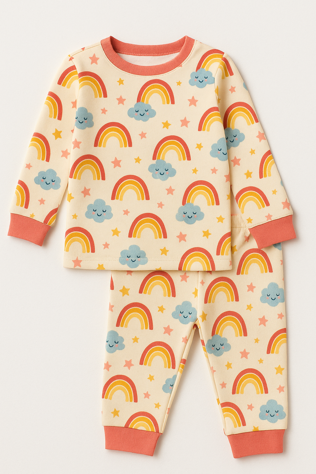 На изображении представлен детский комплект одежды, включающий футболку и штанишки, выполненные из мягкого материала. Футболка имеет длинные рукава и округлый вырез, а штанишки имеют эластичные манжеты. Все предметы одежды украшены веселым и ярким принтом с радугами, облаками и звездами, что делает комплект привлекательным для детей.