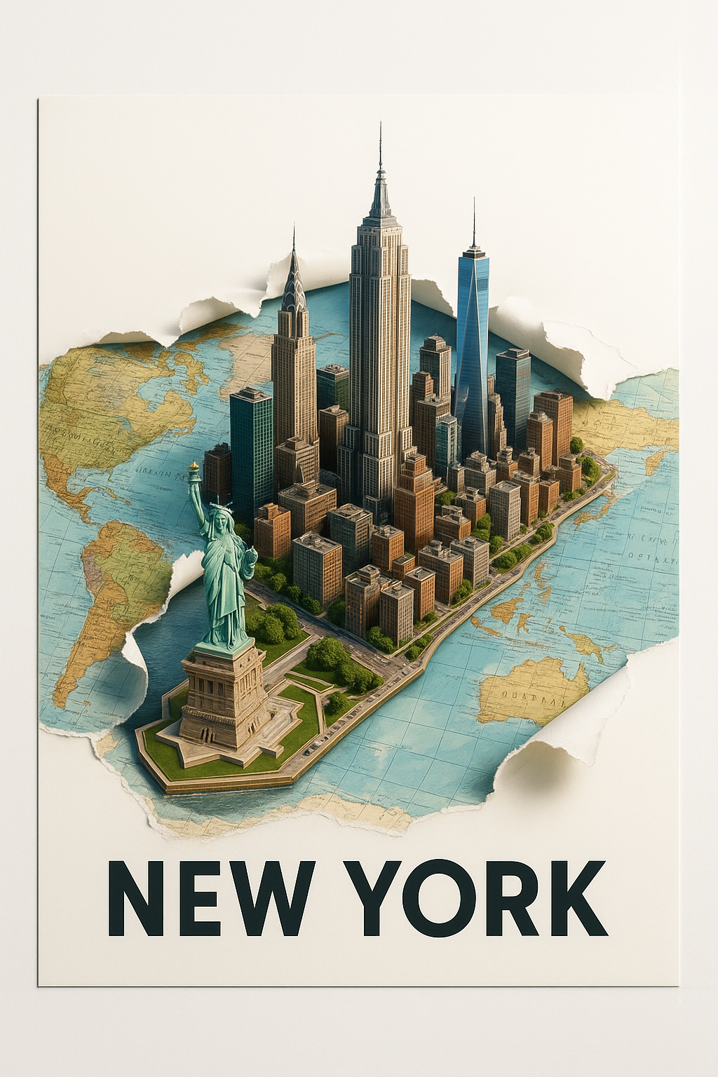Строения выполнены с тщательной проработкой деталей, а фон с картой использует мягкие цвета, создавая контраст с яркими элементами города. Этот визуальный элемент притягивает взгляд и вызывает интерес к культуре и архитектуре Нью-Йорка.