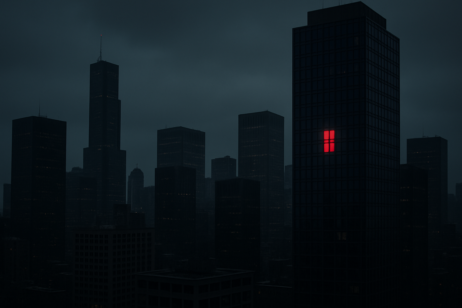 На изображении мы видим городской пейзаж с небоскрёбами, окрашенными в тёмные тона. Окружённые облачным небом, здания выглядят загадочно и внушительно. Особое внимание привлекает одно из зданий, в окне которого горит красный свет. Это яркие контрасты в тёмной обстановке создают атмосферу загадки и интриги. Небо затянуто облаками, и общий фон снимка сделан в холодной цветовой гамме, что усиливает эффект напряжения и ожидания. Каждый небоскрёб имеет уникальные формы и структуры, добавляя динамики к общему виду.