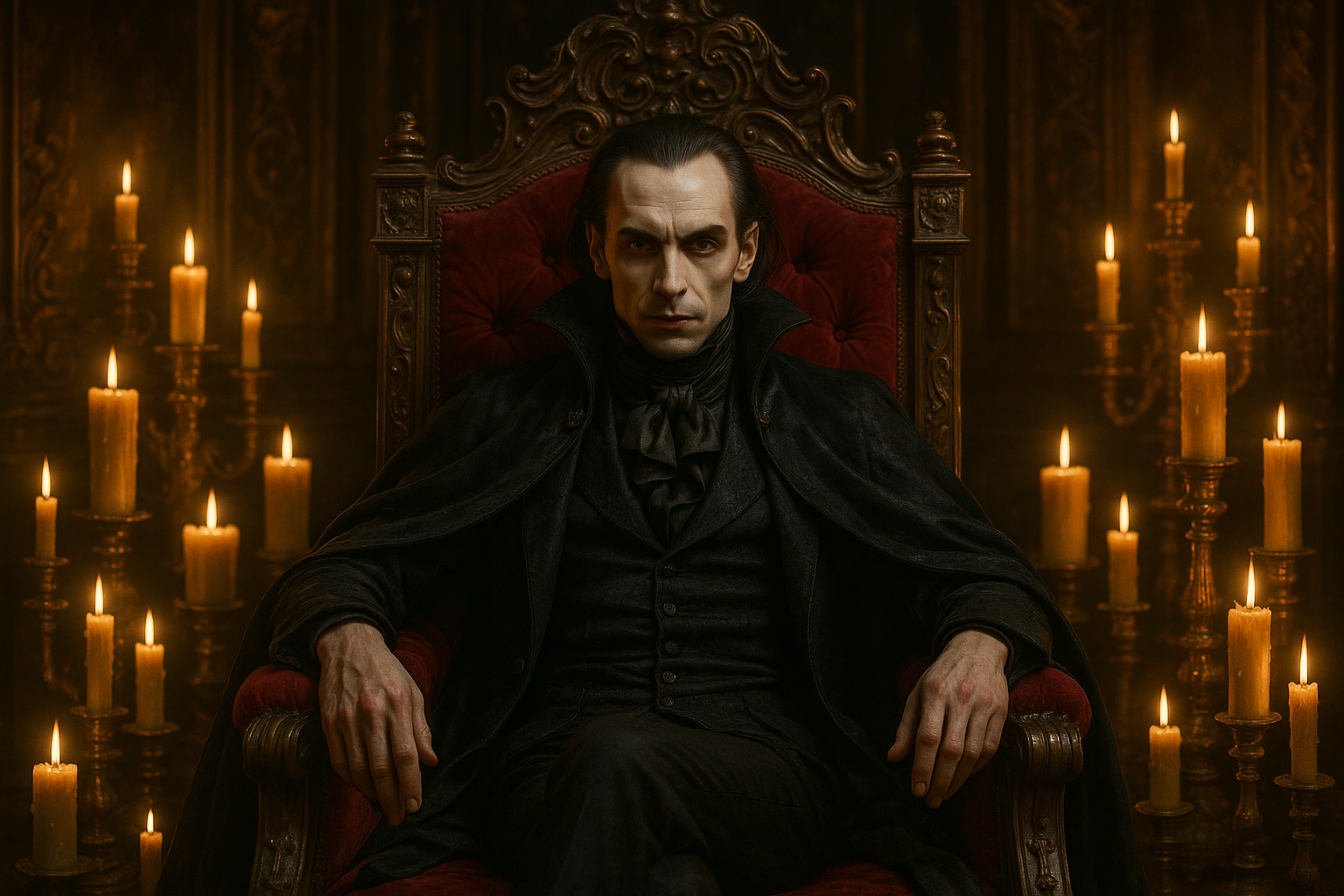 На изображении представлен таинственный готический персонаж, сидящий в роскошном красном кресле. Он одет в элегантный черный костюм с высоким воротником и тщательно завязанным платком. Его волосы аккуратно зачесаны назад, а взгляд полон загадочности и уверенности. Вокруг него расположены множество свечей, создающих атмосферу света и тени. Задний фон оформлен в тёмных тонах, что подчеркивает готическую эстетику и прибавляет глубины композиции.