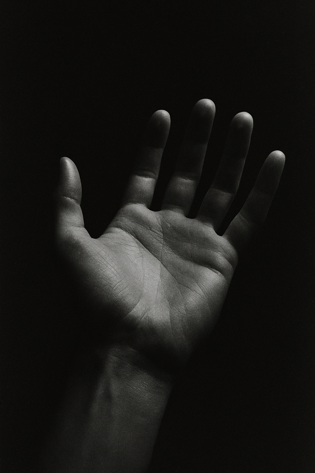 На изображении представлена рука человека, расположенная в ладонном положении на фоне темного, почти черного цвета. Контраст между светлыми оттенками кожи и глубиной черного фона создает сильный визуальный эффект, подчеркивающий детали и текстуру кожи. Внимание привлекают линии на ладони, которые имеют особое значение в различных культурах, где они могут ассоциироваться с предсказаниями и личными чертами. Свет на ладони выделяет форму, создавая легкую тень, что добавляет глубину и объёмности картине. Это изображение может служить примером минимализма и эстетики, зависящей от цвета и формы.