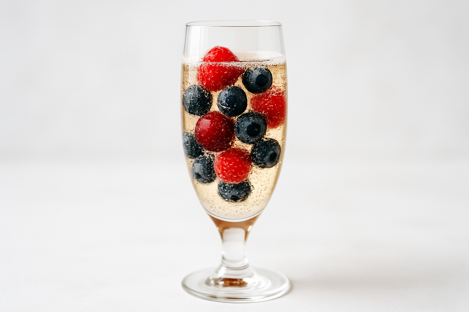 Стеклянный бокал с шампанским и ягодами — малиной и черникой, на светлом фоне