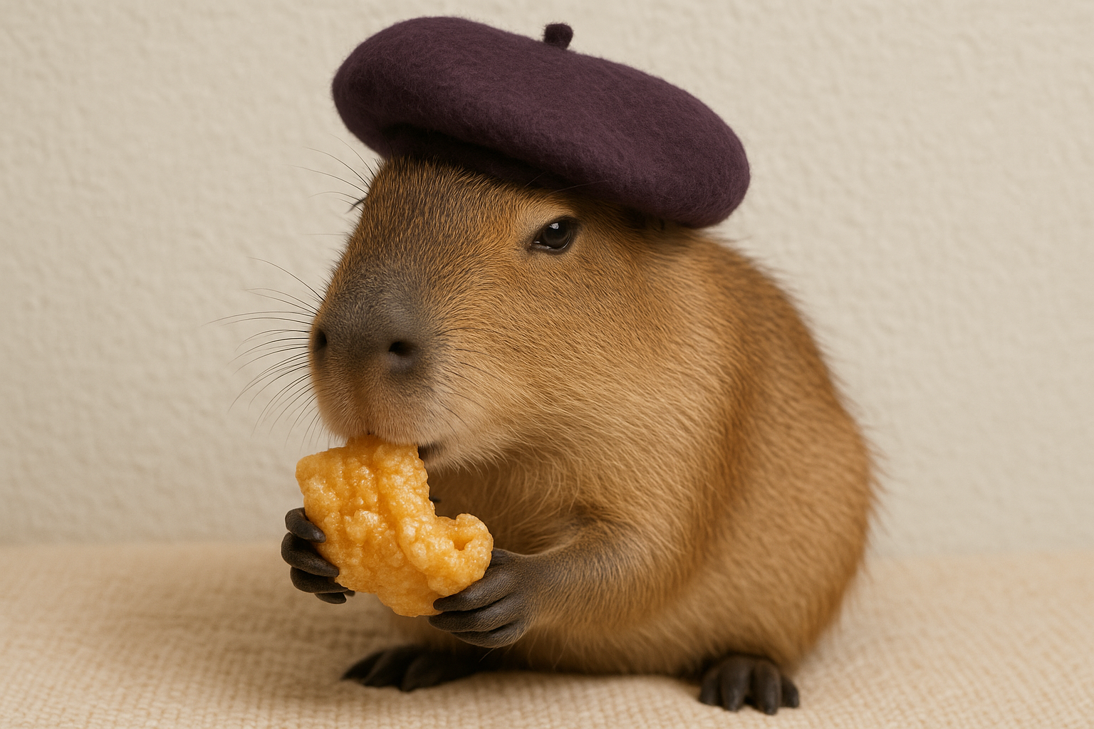 На изображении изображена капибара, одетая в фиолетовый берет, с прекрасными мягкими шерстью и выражением любопытства на лице. Она сидит на светлом текстильном покрытии и держит в своих передних лапах кусок закуски, вероятно, из кукурузного теста. Фон нейтрального цвета создает спокойную атмосферу, подчеркивая образ животного. Капибара, известная своим дружелюбным и спокойным характером, выглядит как будто расслабляется и наслаждается моментом. Такое окружение позволяет акцентировать внимание на ее личности и особенностях.