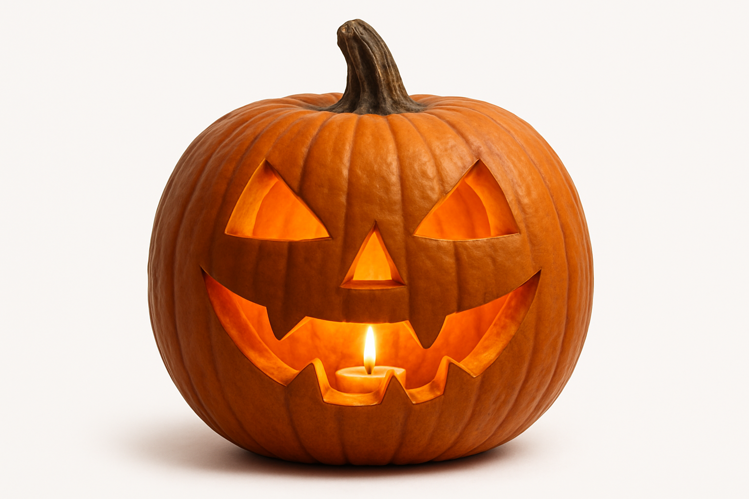 Описание тыквы на Хэллоуин: на изображении представлена тыква, вырезанная в характерном стиле для празднования Хэллоуина. Она имеет выразительное лицо с острыми глазами и широкой улыбкой, что создает эффект загадочности и немного пугливости. Внутри тыквы горит свеча, создающая теплое, мерцающее освещение, что придаёт дополнительный шарм. Фон нейтрального цвета помогает акцентировать внимание на яркой оранжевой тыкве, подчеркивая её детали. Эта тыква является символом осеннего сезона и традиционного праздника, привнося атмосферу праздника и веселья.