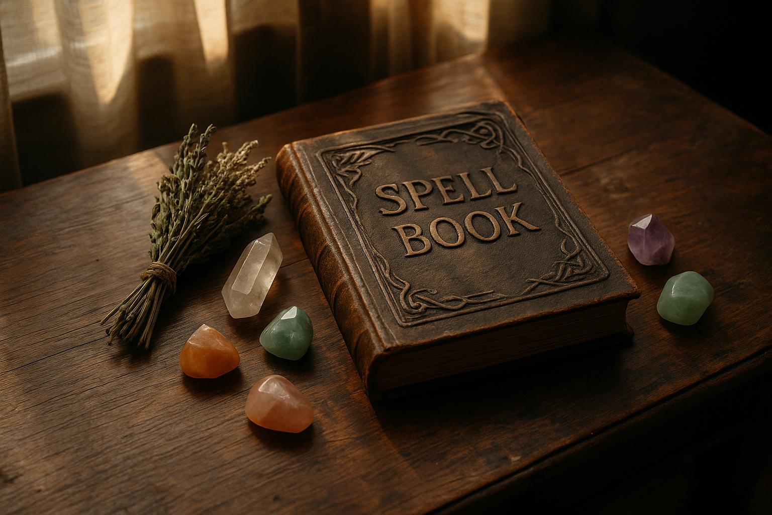 На изображении представлена старая книга заклинаний, названная "Spell Book", которая лежит на деревянном столе. Обложка книги выполнена в темных тонах с рельефным текстом и орнаментами, что придаёт предмету магическую атмосферу. Вокруг книги расположены несколько кристаллов различных форм и цветов: прозрачный, зеленый, фиолетовый и оранжевый. Также рядом с книгой виден пучок высушенных трав, что усиливает дух волшебства и мистики. Задний план изображения мягко размытый, благодаря чему акцент сосредоточен на главных объектах – книге, кристаллах и травах, что создаёт атмосферу спокойствия и таинственности.
