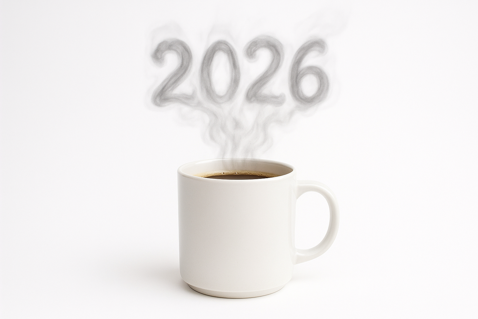 На изображении представлена белая чашка с кофе, из которой поднимается пар, образующий цифры 2026. Чашка расположена на фоне светлого, почти белого цвета, что создает ощущение чистоты и простоты. Пар, поднимающийся над чашкой, имеет мягкие контуры и выглядит как будто он плавно тянется вверх, создавая интересный визуальный эффект. Год 2026 акцентирует внимание на будущем, напоминая о временных перспективах и надеждах, связанных с новыми начинаниями. Чашка кофе выступает не только в роли предмета, но и как символ уюта, тепла и новых возможностей.