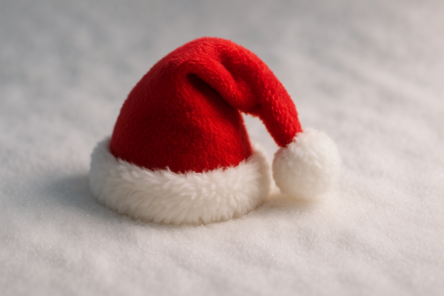 На изображении представлена красная шапка Санта-Клауса, которая находится на белом фоне, напоминающем снег. Шапка выполнена из мягкого флиса и украшена пушистым белым краем и помпоном. Этот предмет является символом Рождества и зимних праздников, олицетворяя праздничное настроение и ожидание чудес. Шапка имеет характерную форму, с закругленным верхом и загнутым краем. Цвета шапки яркие и насыщенные, что делает её привлекательной на фоне чистого белого цвета. Такой элемент декора идеально подходит для создания новогодней атмосферы, а также может служить атрибутом для фотографий и празднований в кругу семьи и друзей.
