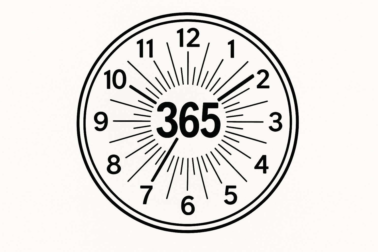 На изображении представлен круглый циферблат, выполненный в черно-белом стиле. В центре циферблата размещено число 365, окруженное радиальными лучами, которые расходятся в стороны. Циферблат содержит деления от 1 до 12, обозначающие часы, и числа от 1 до 12, расставленных по кругу. Данная композиция создает эффект движения и динамики. Фоновый цвет циферблата остается светлым, что делает изображение более минималистичным и лаконичным.