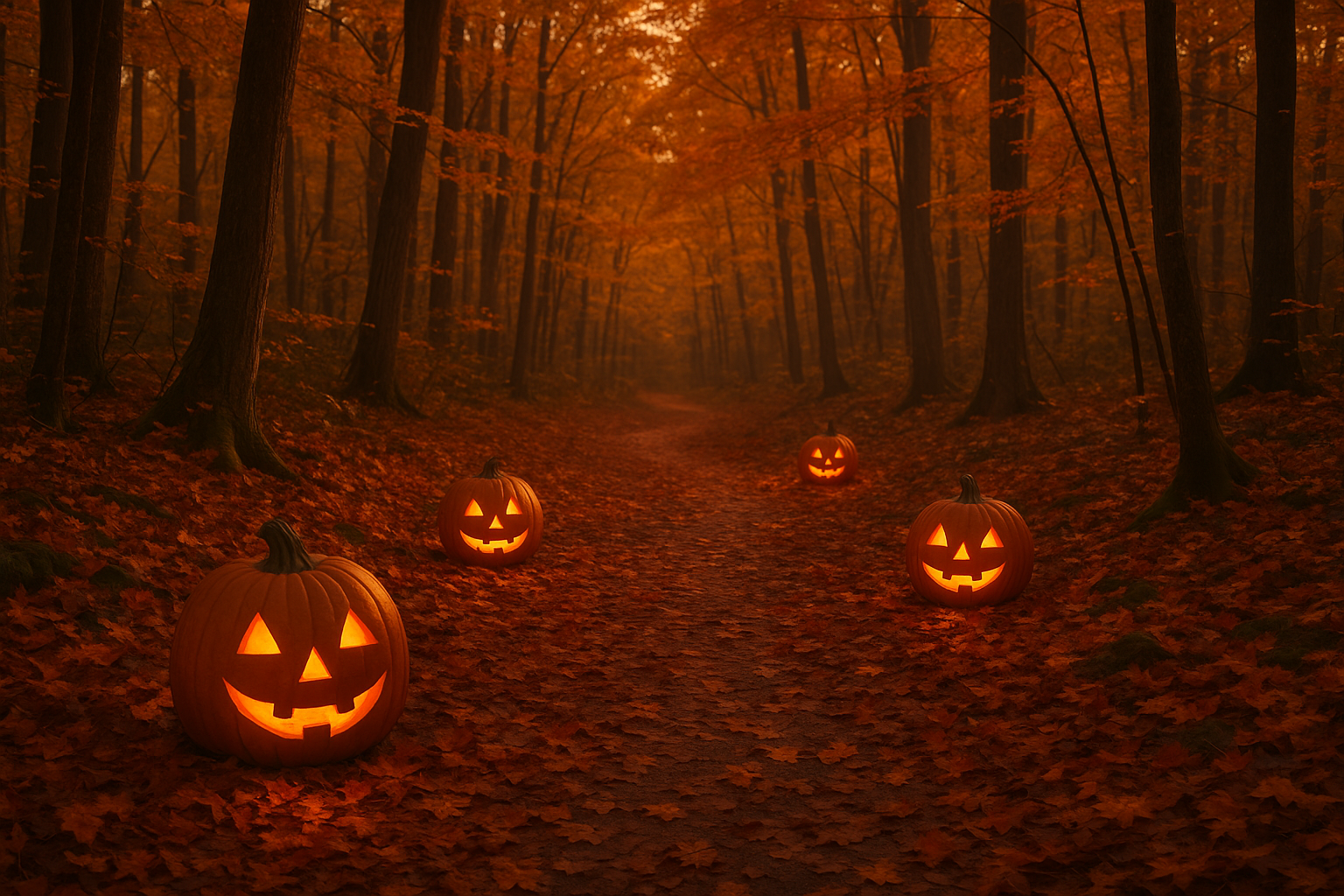На изображении представлена живописная лесная дорожка, окруженная высокими деревьями, стоящими в красивом осеннем убранстве. Листья деревьев окрашены в яркие оттенки оранжевого и желтого, создавая теплую атмосферу. Вдоль дорожки расположены четыре тыквы, ярко светящиеся изнутри, с резными лицами, придающими изображению загадочный и праздничный вид. Свет от тыкв создает уютное и спокойное освещение на фоне вечернего леса. Сумеречное время суток усиливает эффект волшебства и таинственности картины.